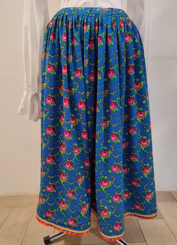 Spódnica krakowska w kolorze niebieskim w kwiaty, obszyta czerwoną taśmą.