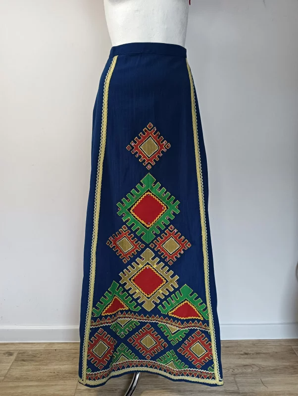 Długa spódnica - tkanina elana, malowana, zdobiona taśmami. Zapinana na haftki z możliwością zmniejszenia obwodu.