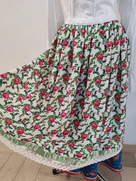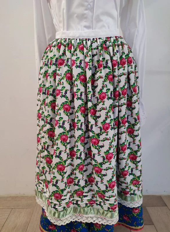 Zapaska krakowska, biała w kwiaty, zdobiona wstążką i ozdobną taśma na brzegach.