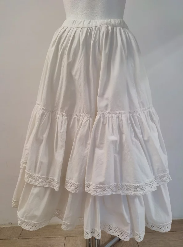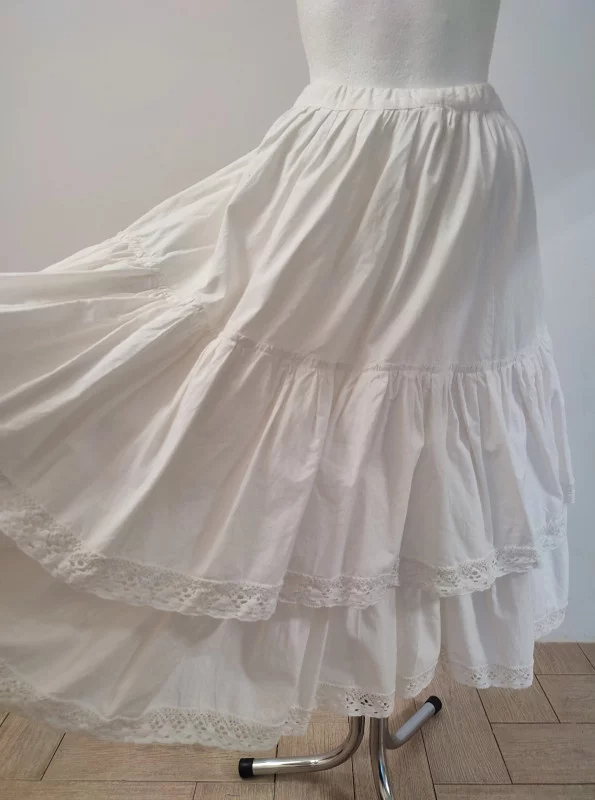 Biała halka z dwoma falbanami, obszyta koronkową taśmą na brzegach.