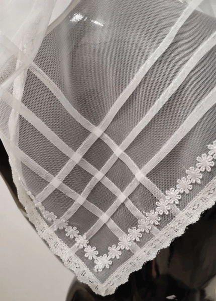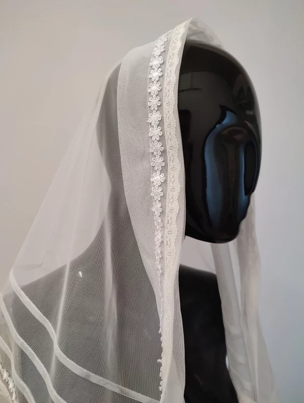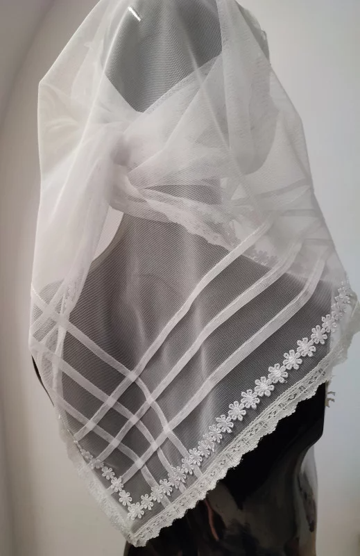 Chusta na głowę dla mężatek, zdobiona taśmami w kwiaty. Możliwość wiązania w dowolny sposób.
