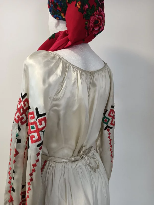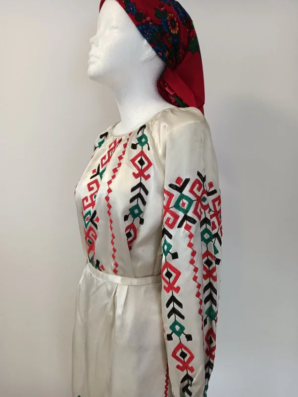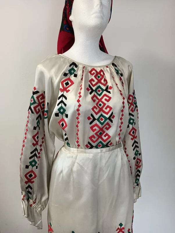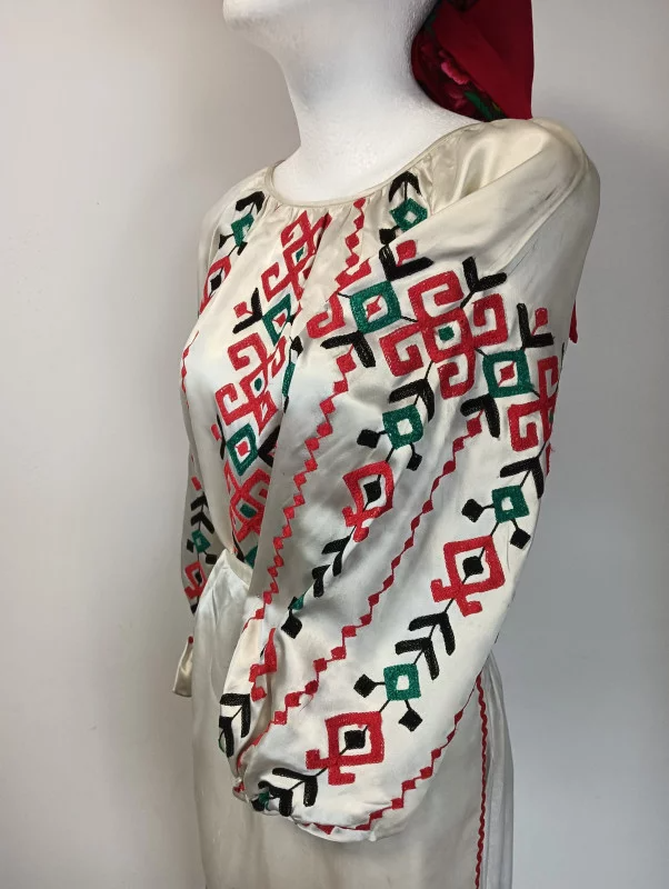 Bluzka biała z satynowej tkaniny, zdobiona haftem, bez kołnierza.