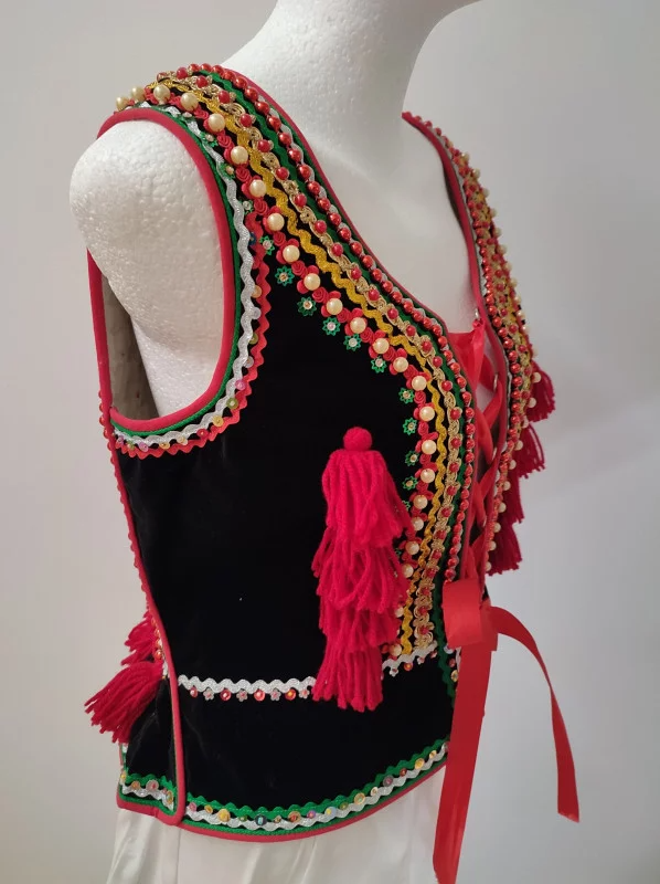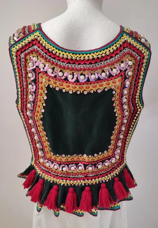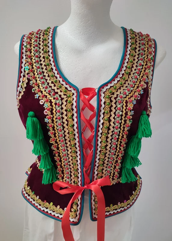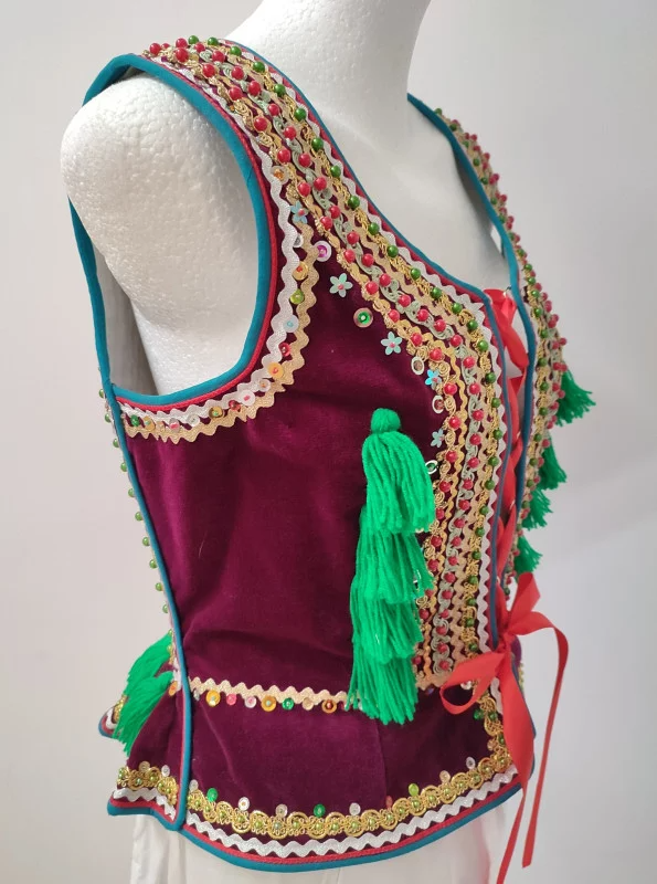 Gorset krakowski, uszyty z aksamitu w różnej kolorystyce, zdobiony koralikami, pomponami i ozdobnymi taśmami.