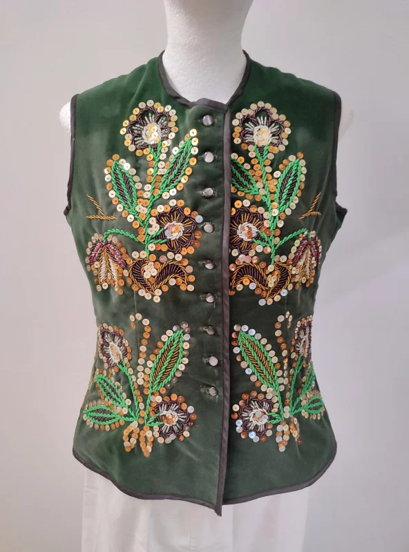 Gorset przeworski uszyty z zielonego aksamitu, zdobiony kwiatowymi wzorami z koralików.