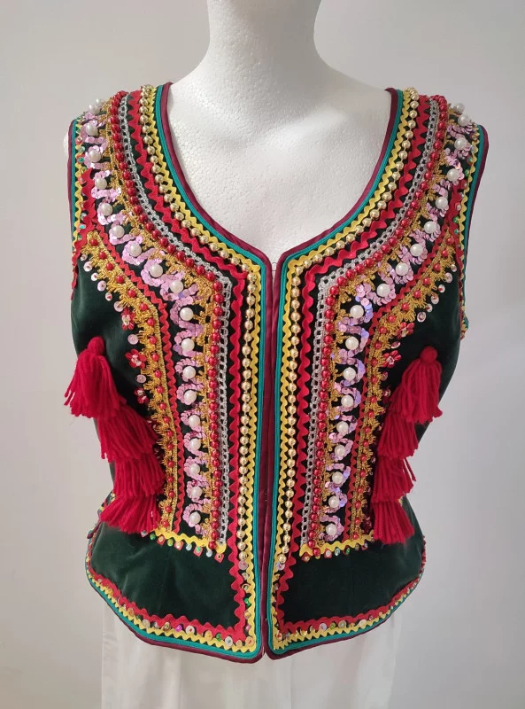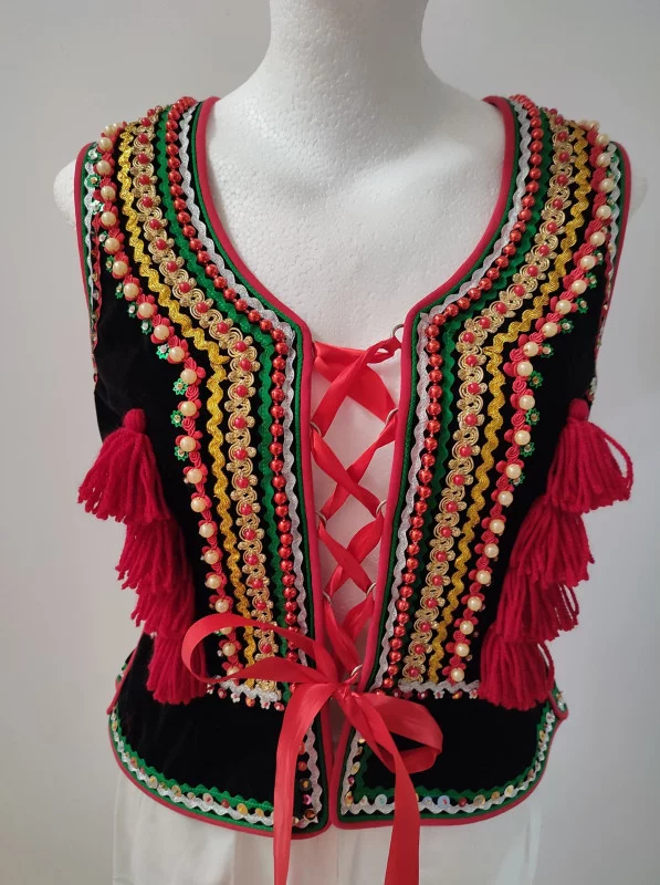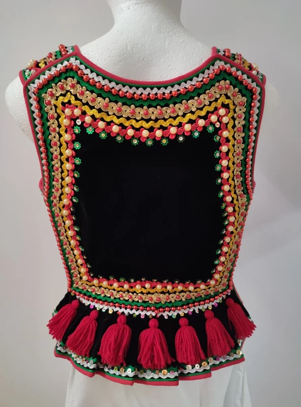Zdobiony koralikami, pomponami i ozdobnymi taśmami.