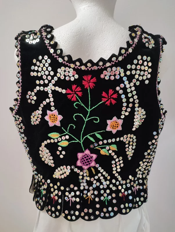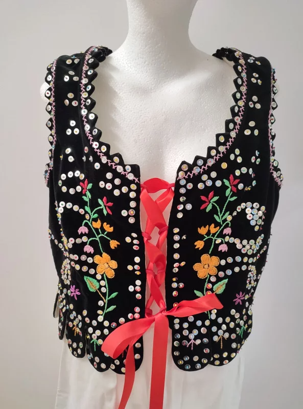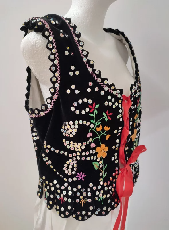 Gorset rzeszowski staromiejski uszyty z czarnego aksamitu, zdobiony kwiatowymi wzorami z koralików i cekinów.