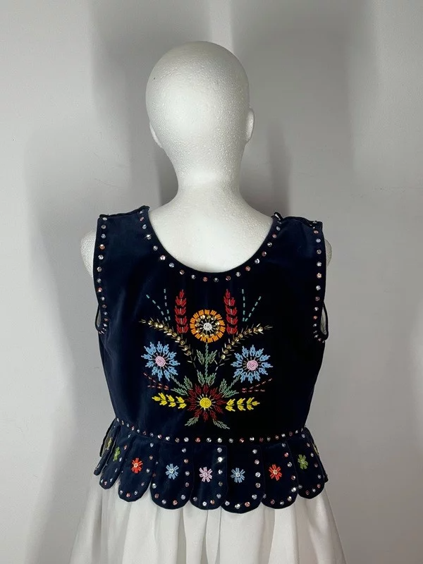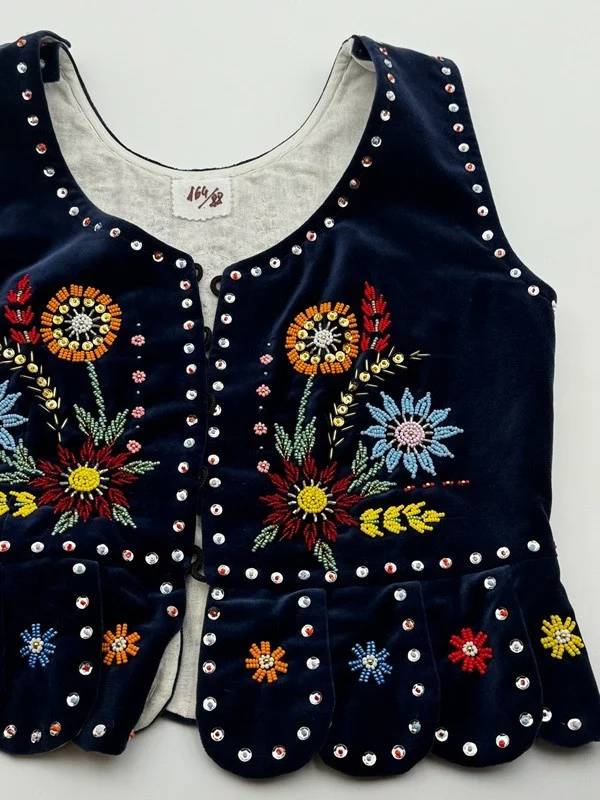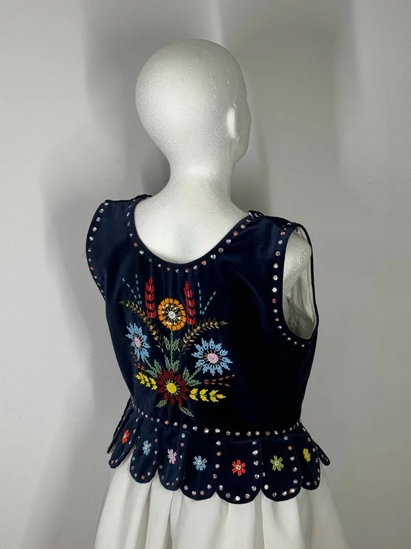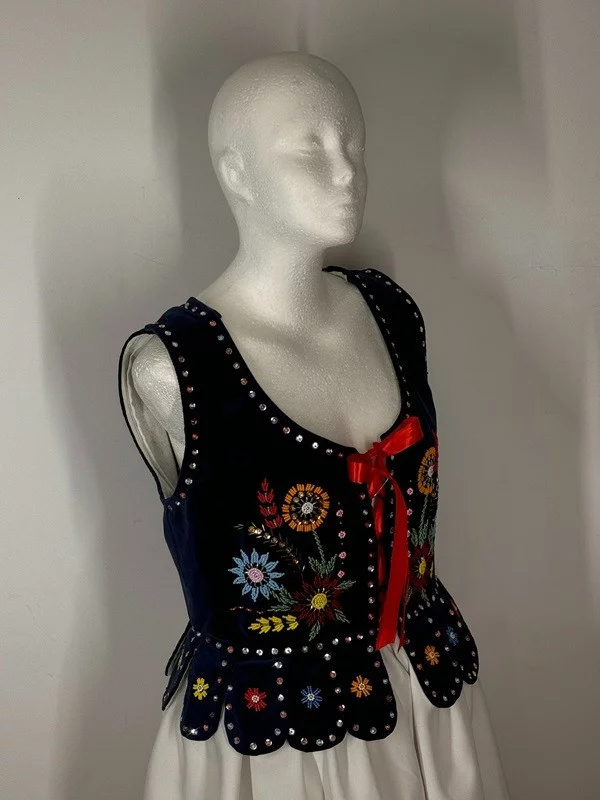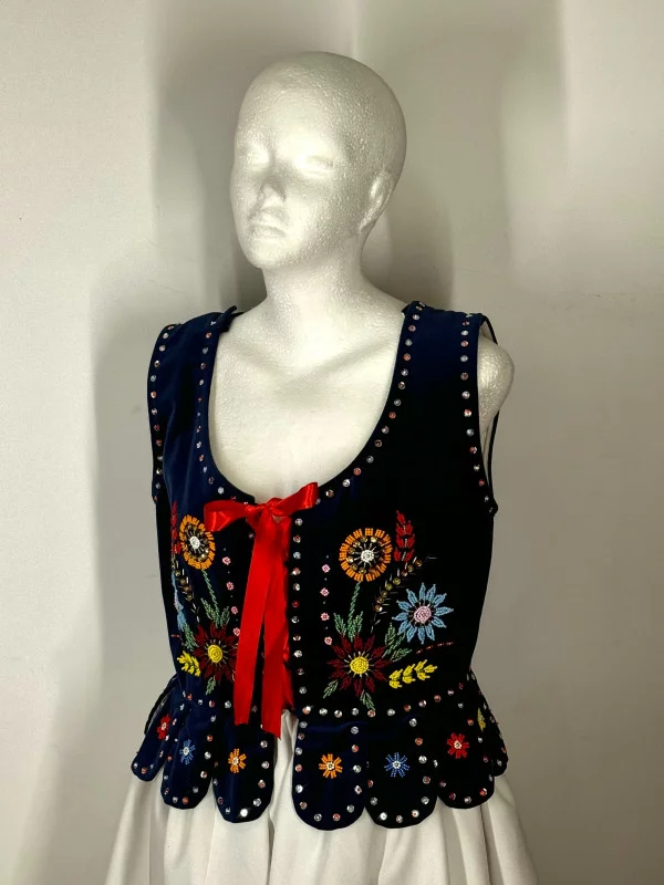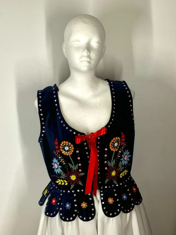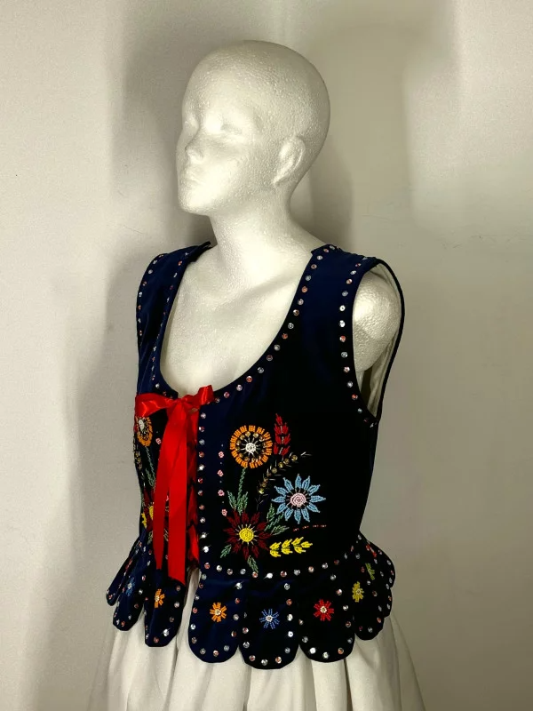 Gorset rzeszowski z granatowego aksamitu, na bawełnianej podszewce, ręcznie wyszywany koralikami i cekinami, z przodu sznurowany wstążką, w pasie obszyty kaletkami.