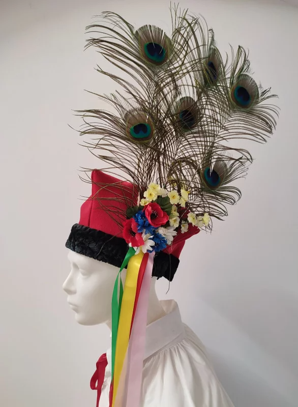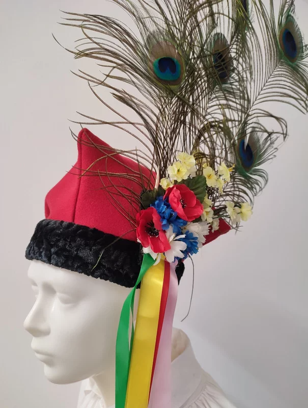 Krakowska czapka ze stroikiem złożonym z sztucznych kwiatów, 6 pawich piór i wstążek. Stroik przyczepiony na rzep.