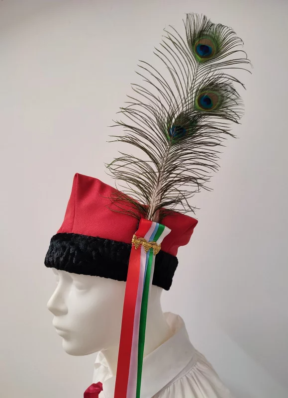 Krakowska czapka ze stroikiem złożonym z sztucznych kwiatów, 3 pawich piór i wstążek. Stroik przyczepiony na rzep.