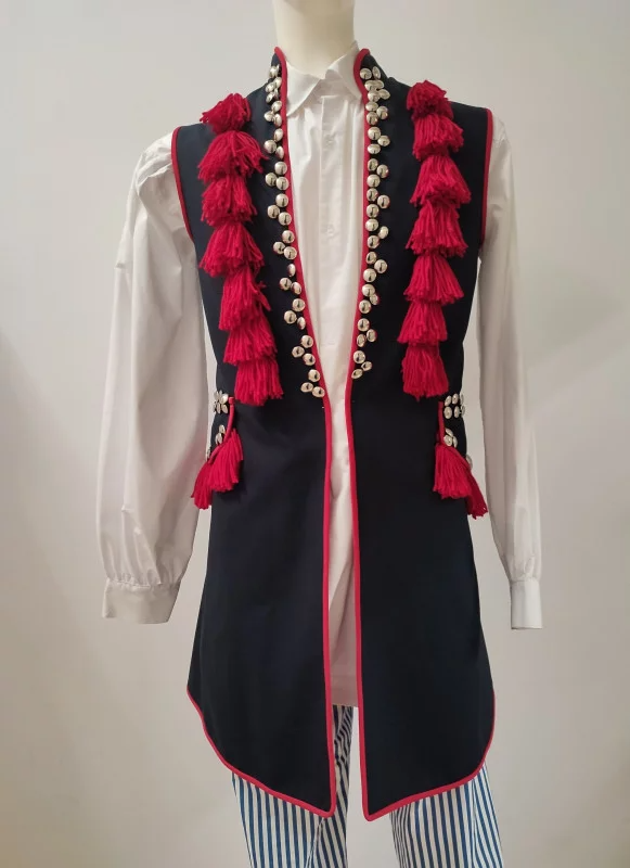 Kamizela krakowska uszyta z granatowej tkaniny, zdobiona czerwonymi pomponami i guzikami, bez haftów.