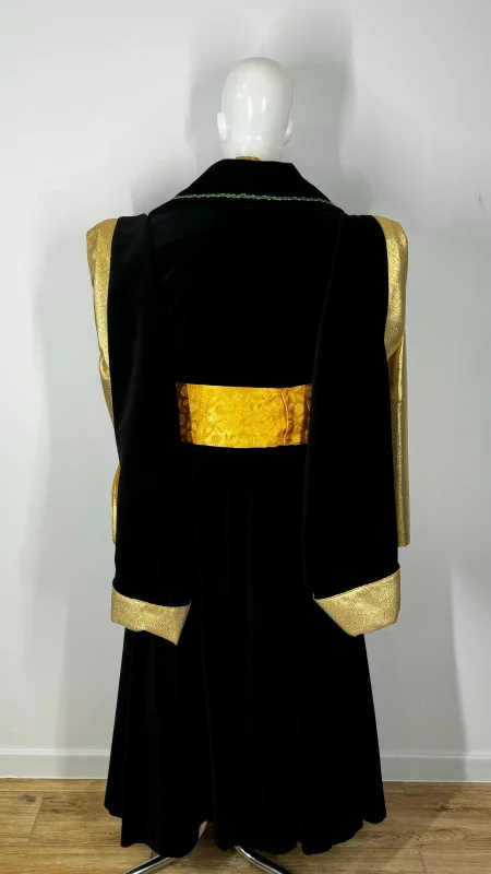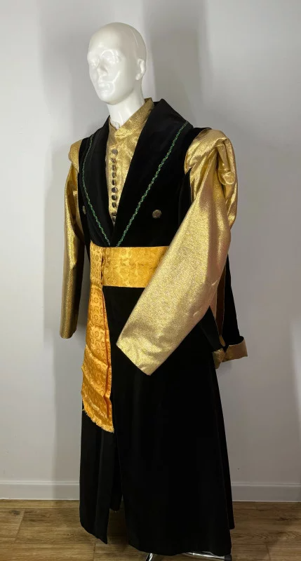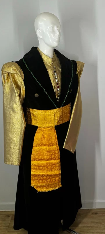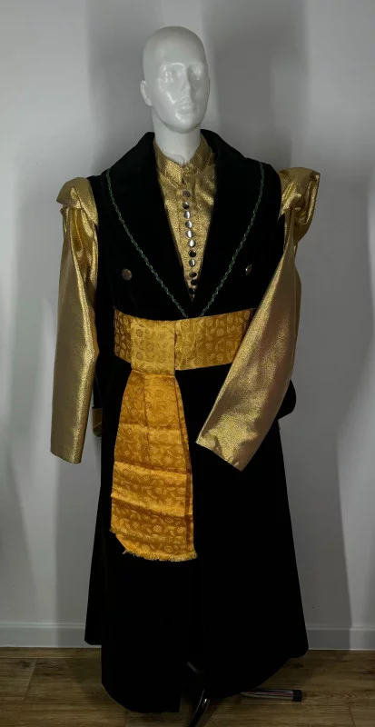 Kontusz męski uszyty z czarnego aksamitu, wykończony złotą tkaniną, z przodu imitacja żupana (kontusz łączy w 1 element okrycie wierzchnie i żupan). Do kompletu dołączony pas.
