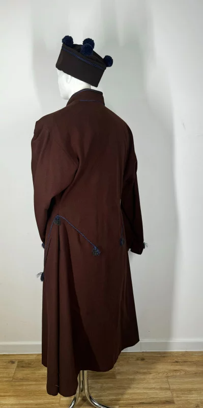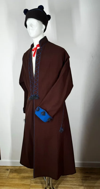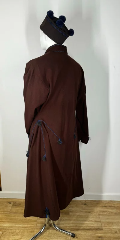 Męska sukmana biłgorajska, uszyta z wełnianego sukna, ozdobiona granatowym sznurkiem, Posiada otwór na kieszenie.