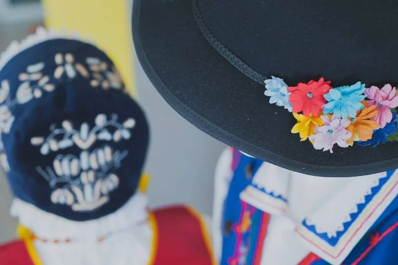Kostium damski złożony z koszuli haftowanej na rękawach, taki sam haft zdobi zapaskę, spódnica obszyta ozdobną taśmą, haftowany gorset czerwonego aksamitu oraz czepek wiązanego pod szyją, uszyty z czarnego aksamitu haftowanego złotymi nićmi.
