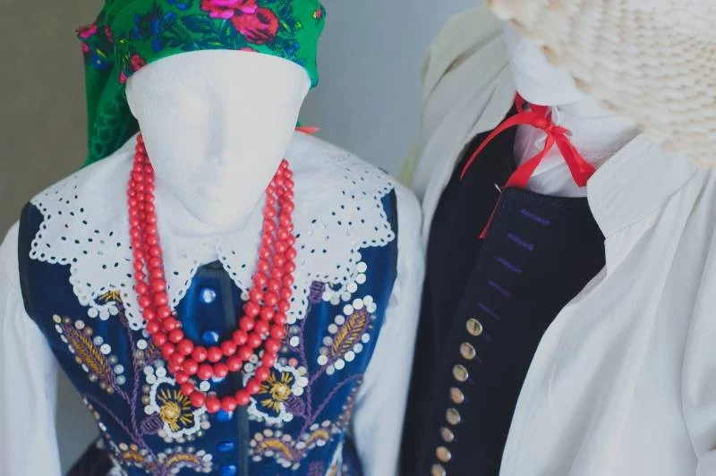 Strój damski to spódnica w kratę z wyszywaną koronką białą zapaską, aksamitny gorset z wyszytymi koralikami kwiatami, biała koszula z haftem oraz chustka z tiulu ( na zdjęciu klasyczna w kwiaty z frędzlami).