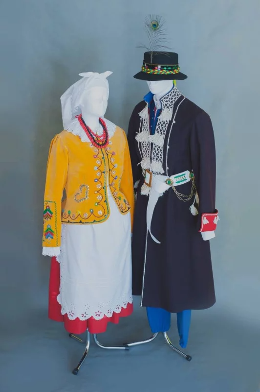 Strój męski to kamizela i haftowane spodnie, biała koszula z kołnierzem, kapelusz, biały skórzany pas, może być dodatkowo sukmana ze zdobieniem z białej włóczki.
